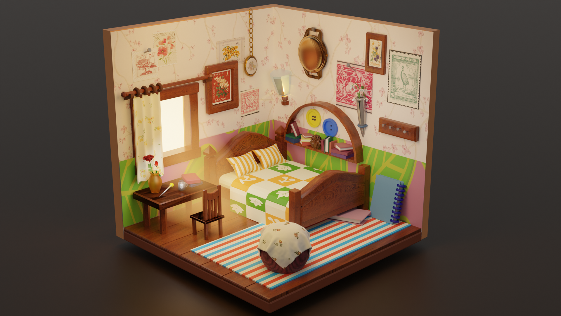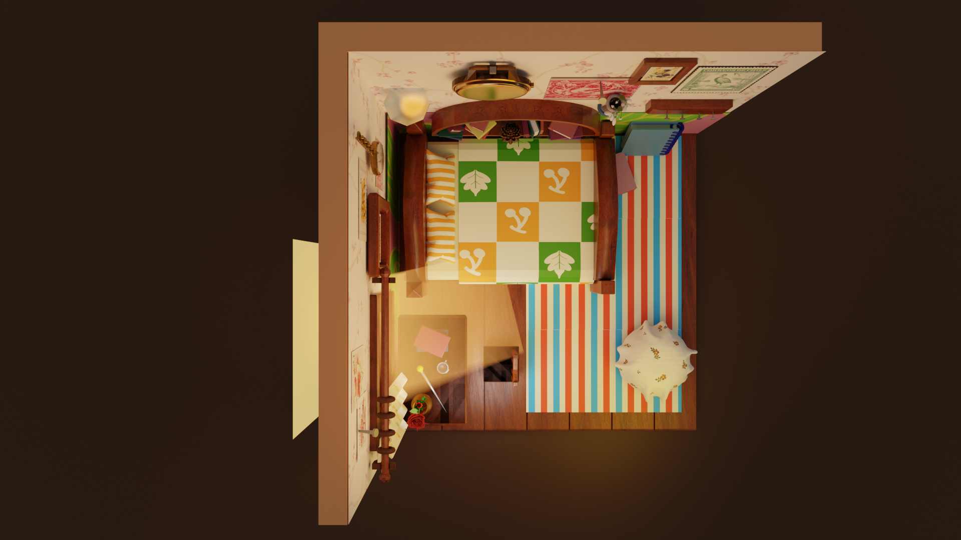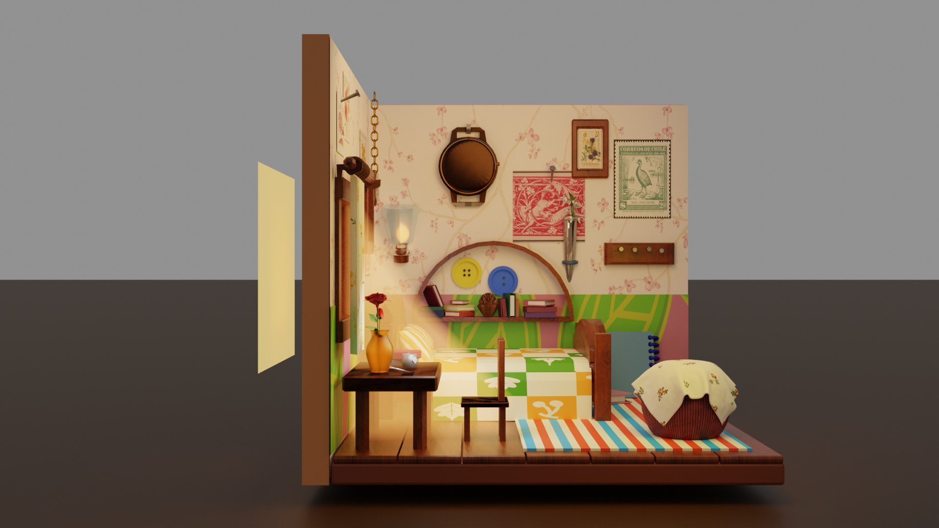 I began by analyzing scenes from the film, studying composition, color, and object placement to understand how Arrietty’s room conveys character and emotion. Using Blender, I translated these observations into a detailed 3D diorama, modeling, texturing, and lighting each element to capture the cozy, handcrafted charm of the original space.