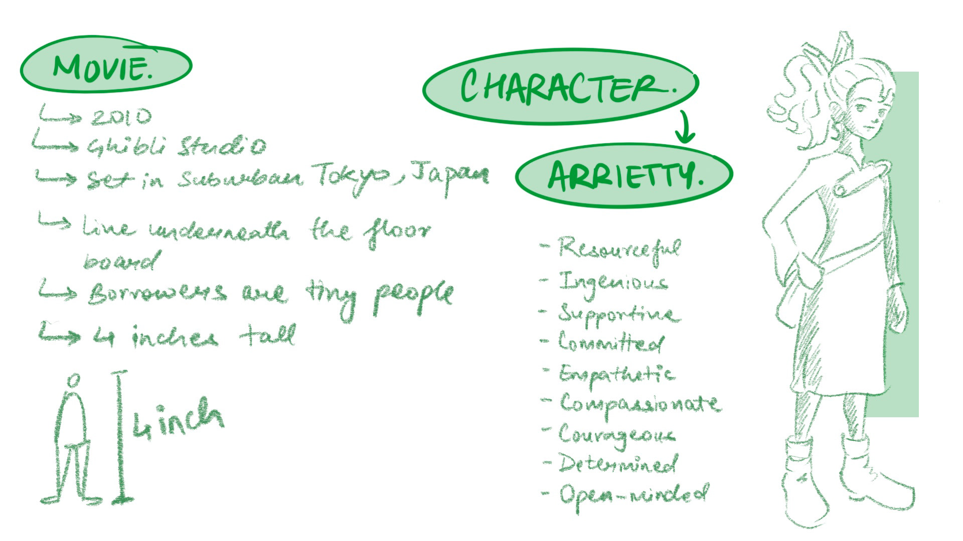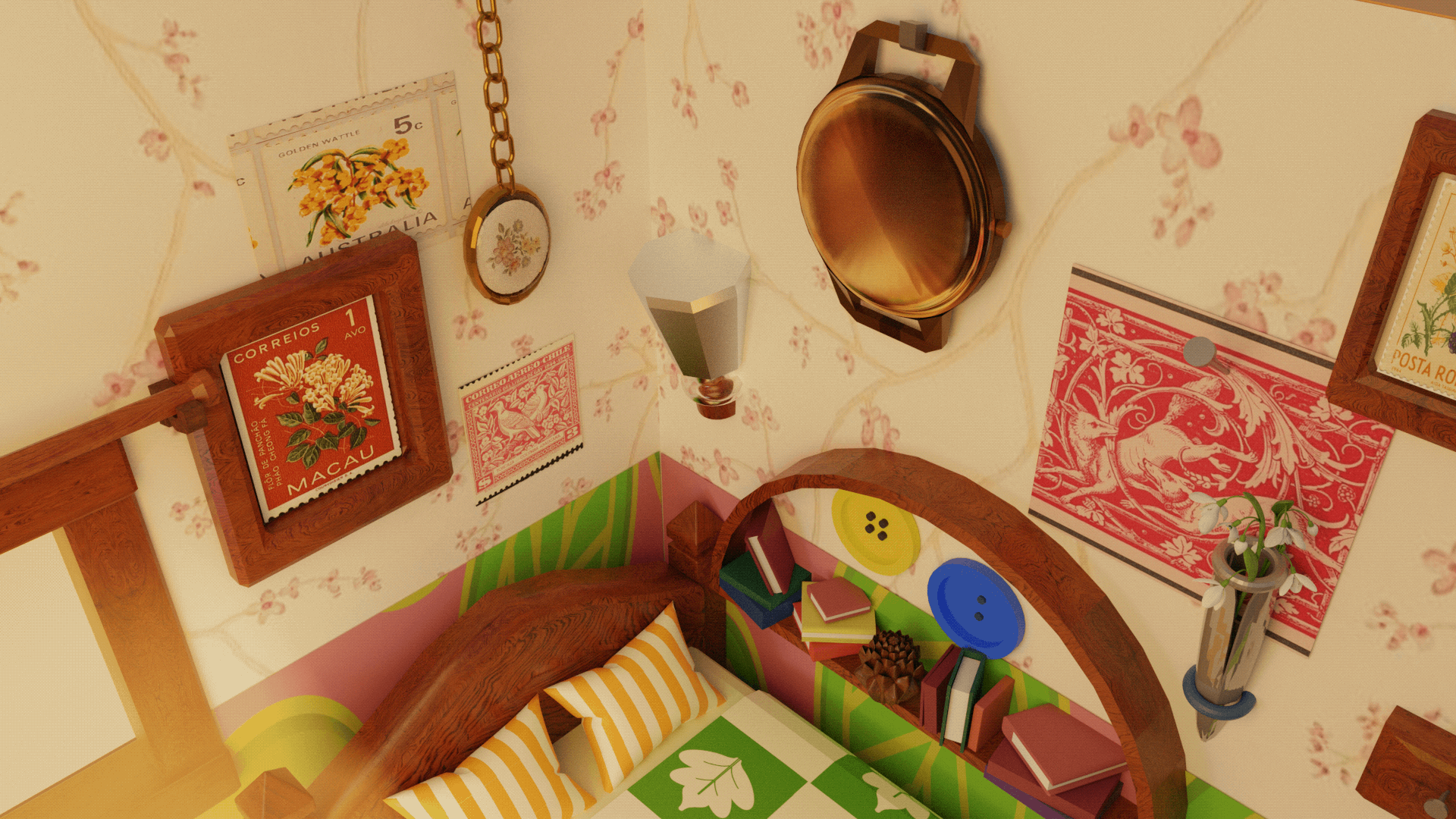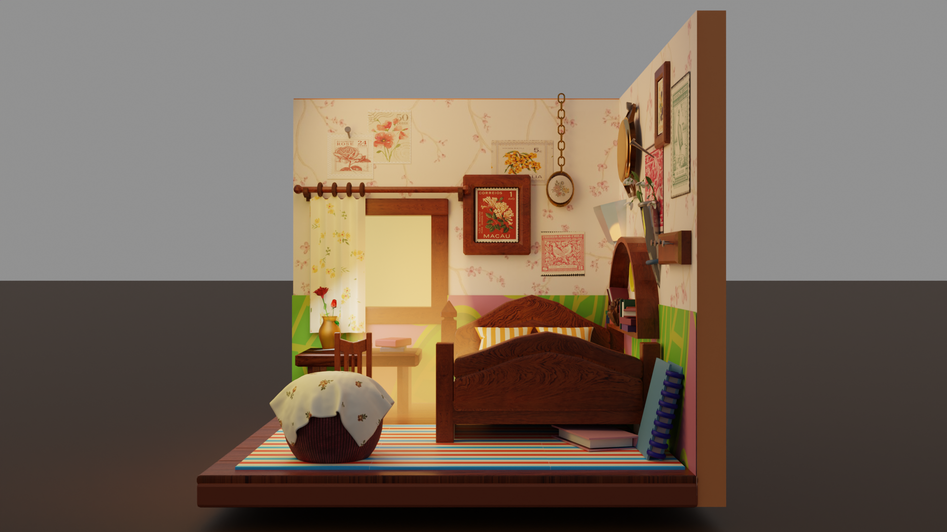 I began by analyzing scenes from the film, studying composition, color, and object placement to understand how Arrietty’s room conveys character and emotion. Using Blender, I translated these observations into a detailed 3D diorama, modeling, texturing, and lighting each element to capture the cozy, handcrafted charm of the original space.