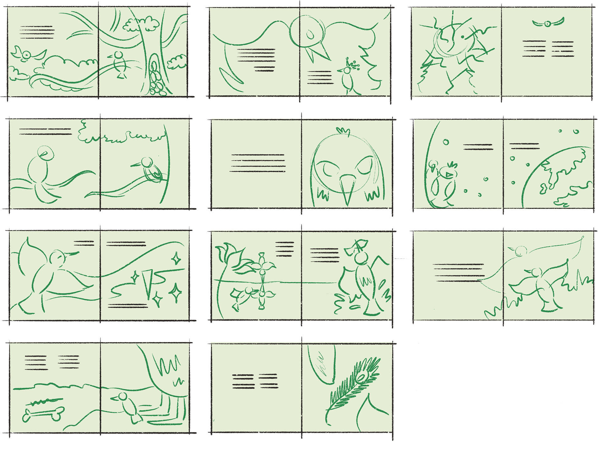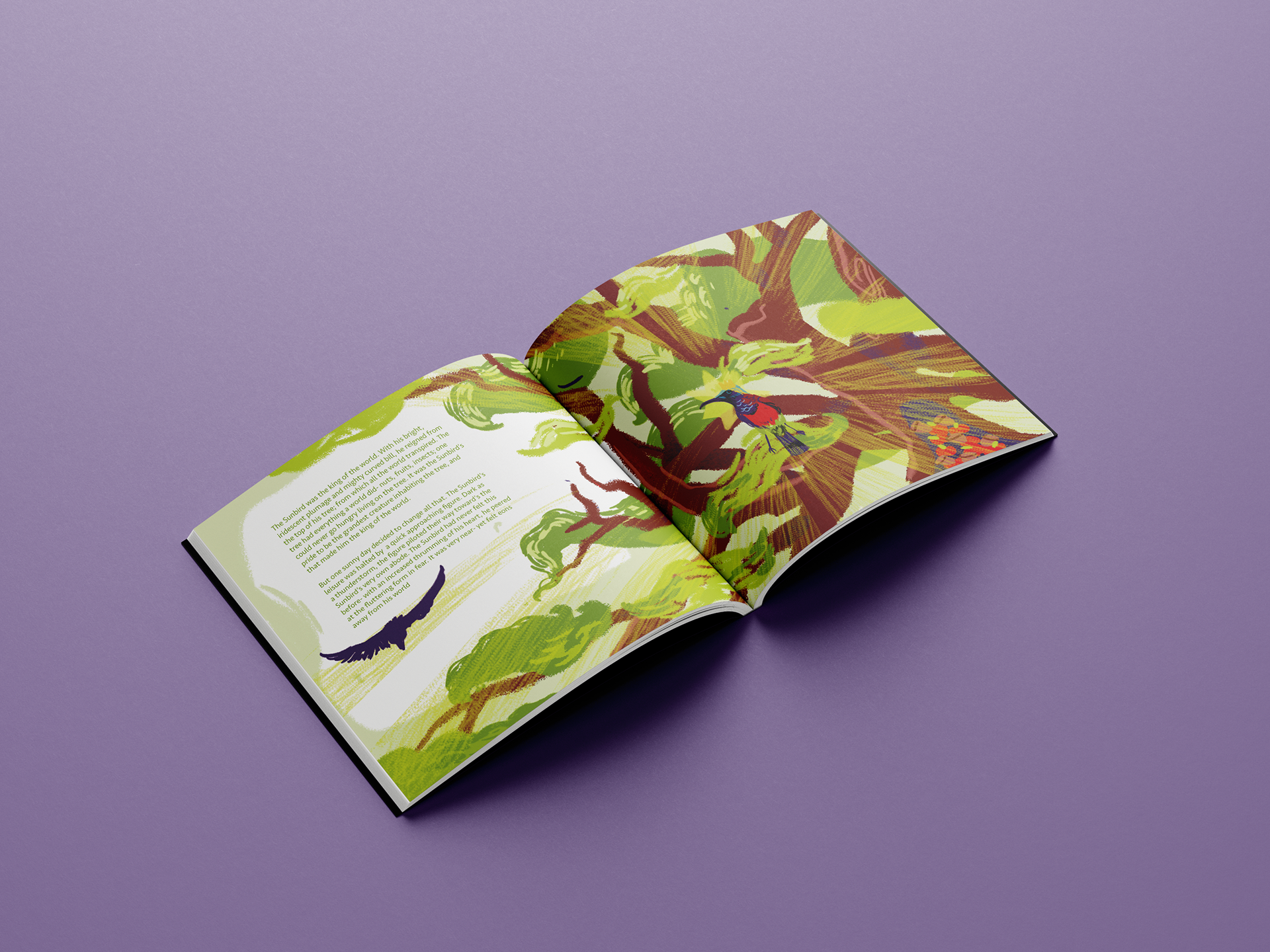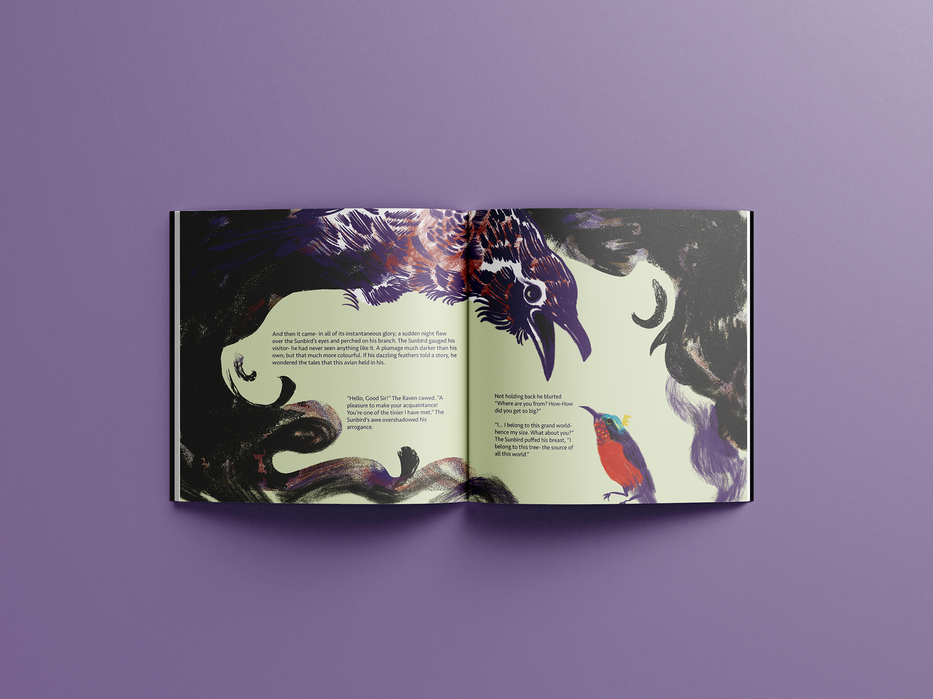 The narrative was illustrated through a sequence of framed spreads combining character design, habitat scenes, and poetic pacing. Each bird encounter is represented visually and conceptually to reflect the Sunbird’s growth, using ambient colour, expressive composition, and minimal text to evoke atmosphere and emotion.
