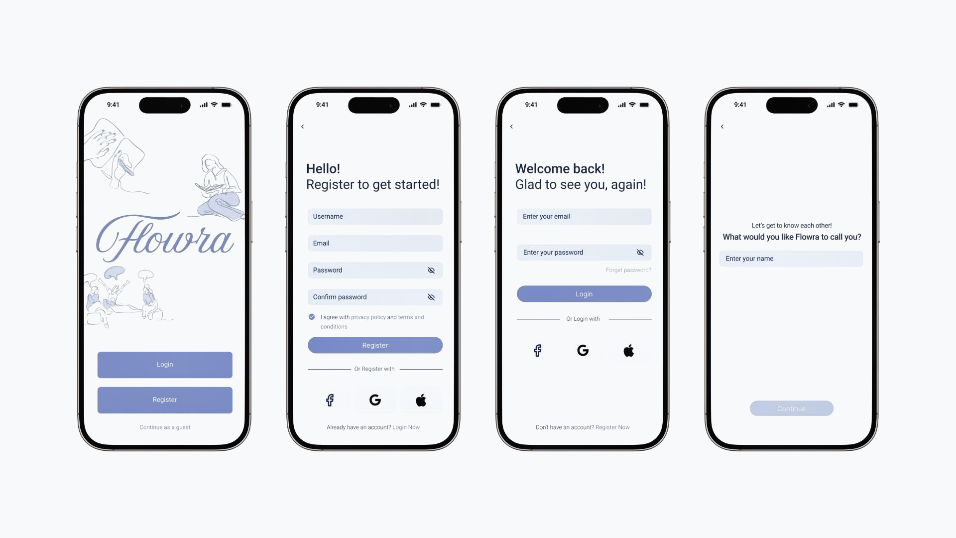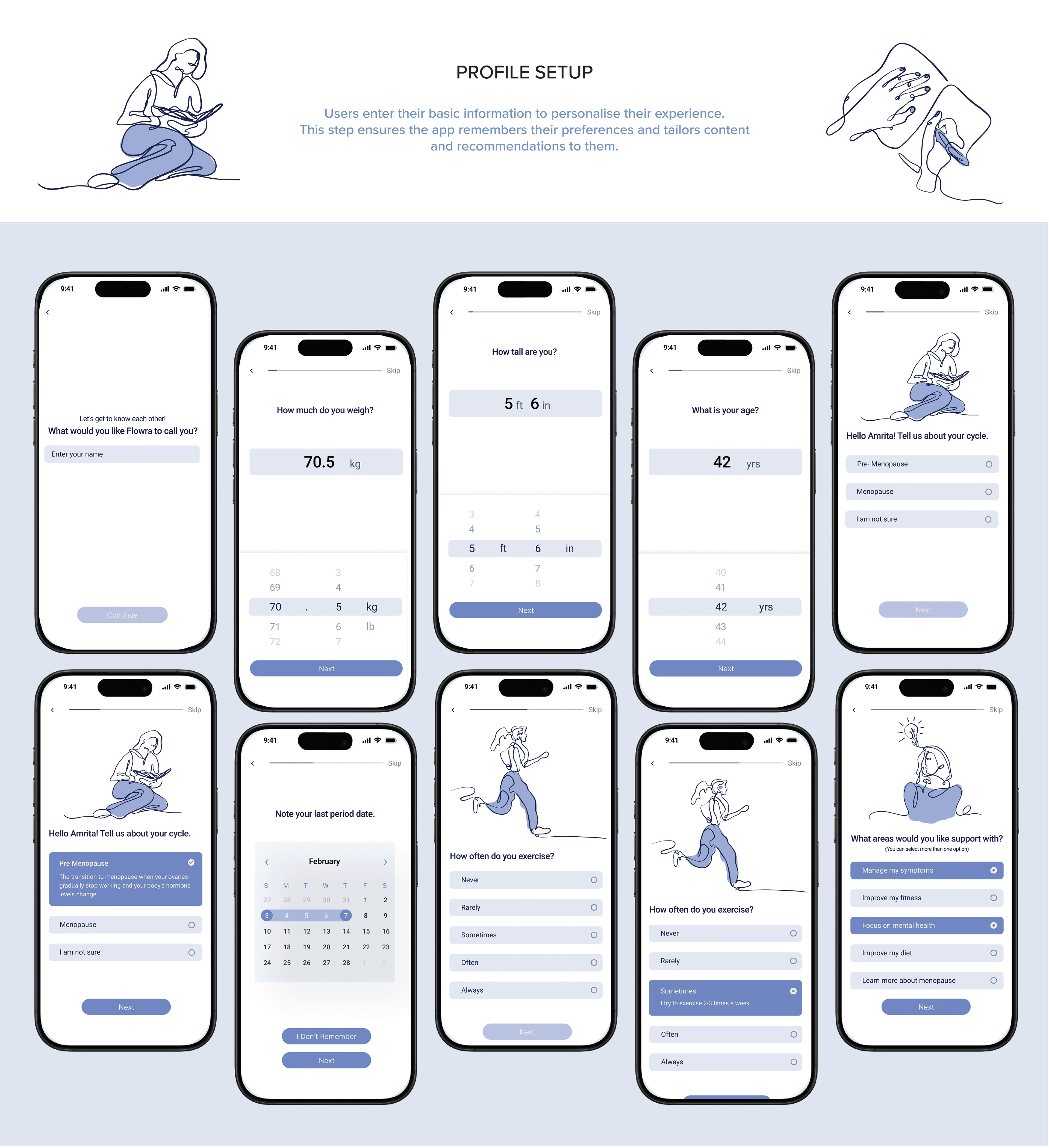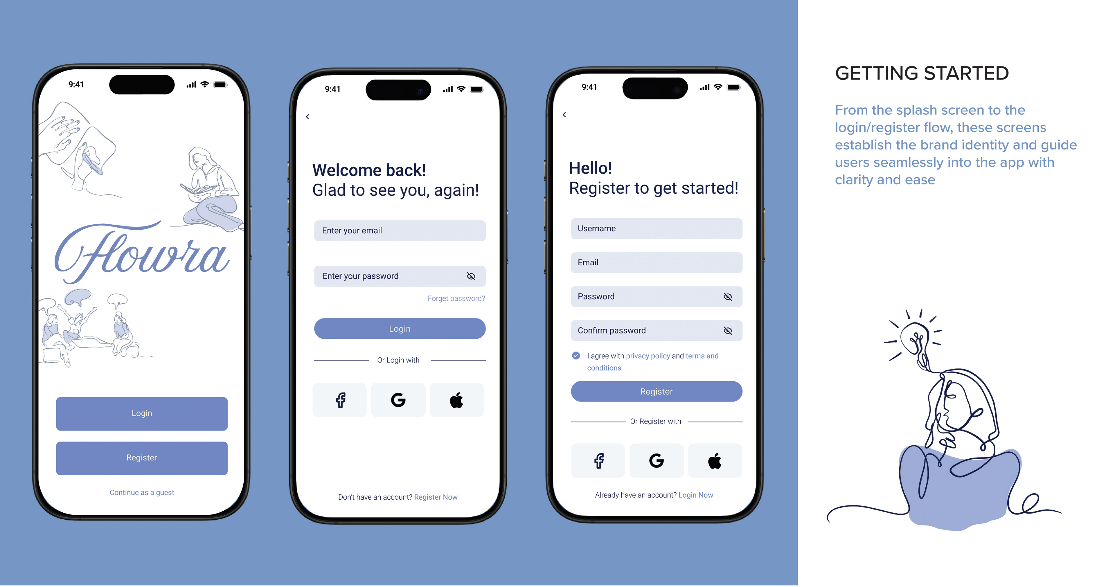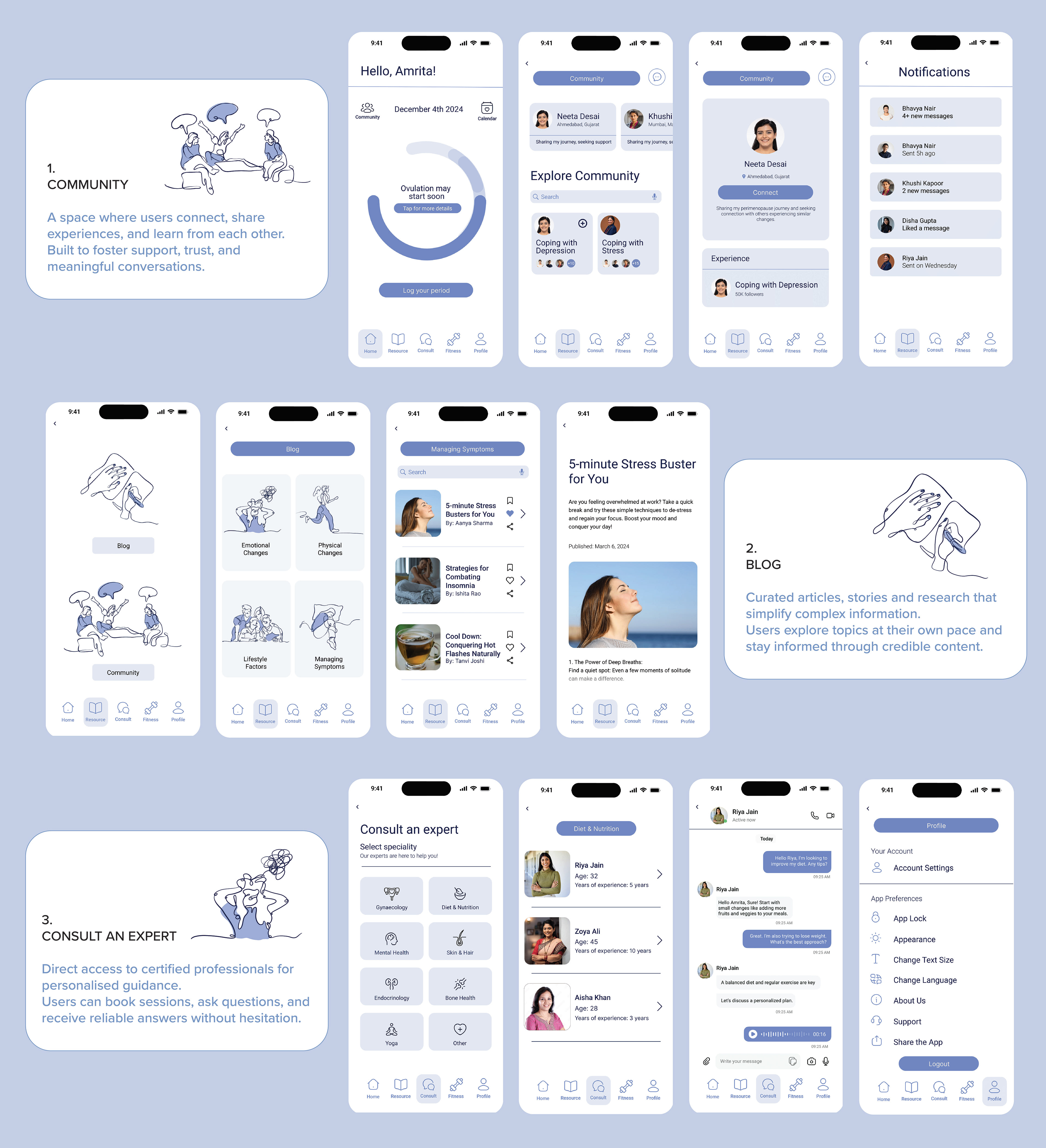 Flowra’s design approach centered on care and reassurance. Every visual and interaction was considered to reflect emotional balance, transforming what is often seen as an isolating phase into one of understanding and connection.