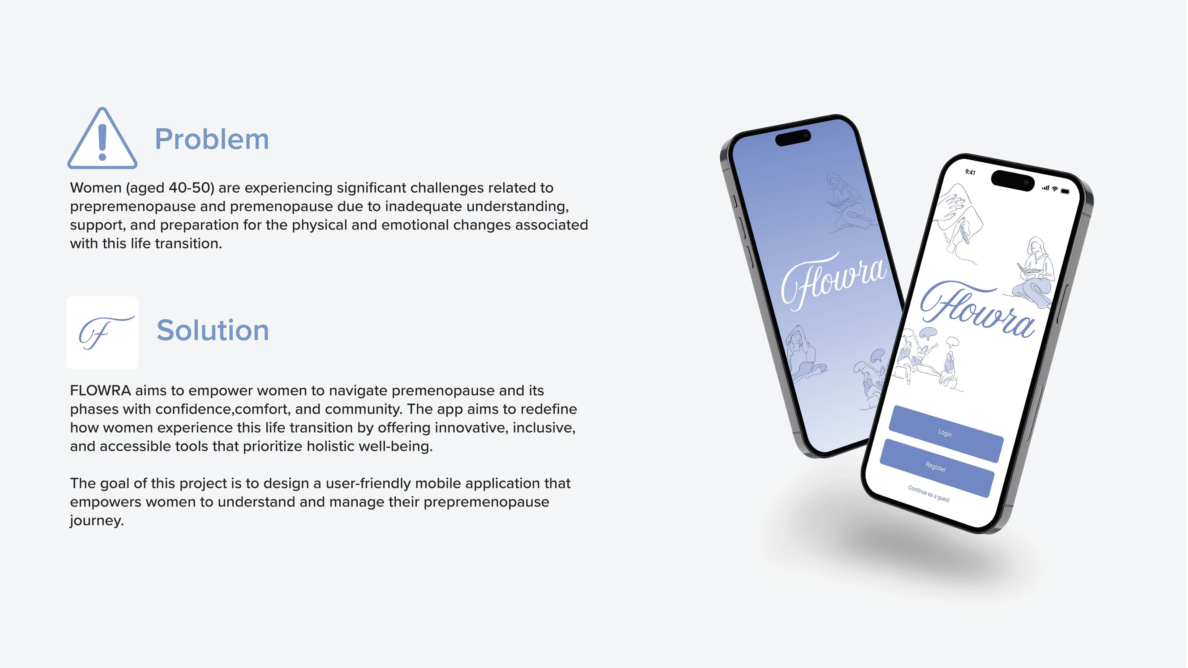 Flowra is a wellness app designed to support women through the premenopausal phase with confidence and care. The concept focuses on creating a safe, informative, and empowering digital space that normalizes conversations around hormonal health and self-awareness.